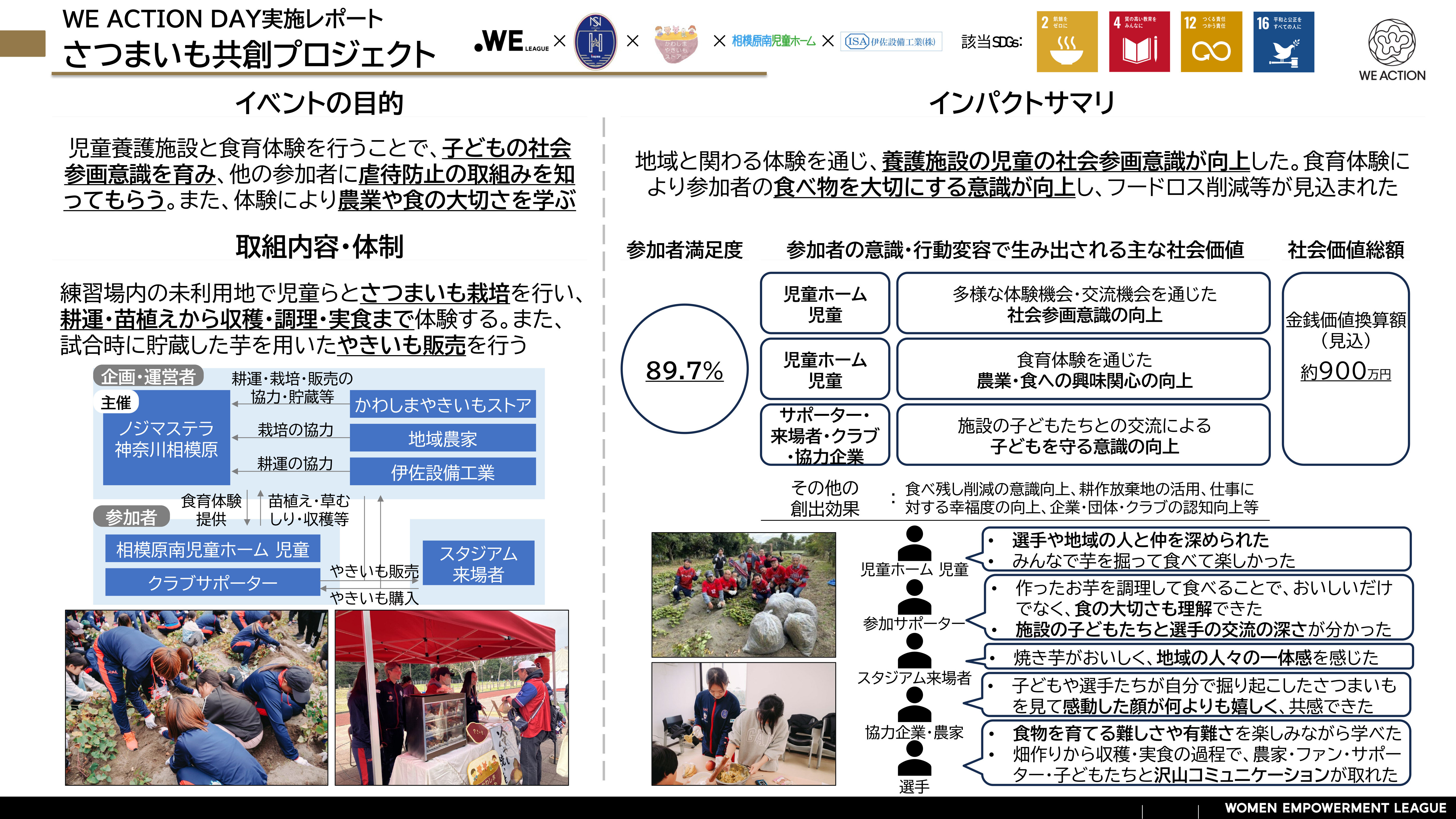 ノジマステラ神奈川相模原では相模原市の「耕作放棄地」を活用しさつまいもを育てている「かわしまやきいもストア」、同じ地元(南区新戸)にある児童養護施設の相模原南児童ホームと協働し、今シーズンも練習場(ノジマフットボールパーク)内でさつまいもを栽培する「さがみはらさつまいも共創プロジェクト」を実施しています。