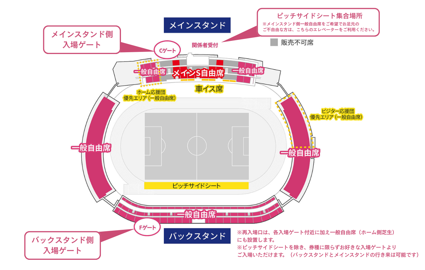 今回は統合された「一般自由席」へのご案内となり、メインスタンドA側のエリアを確約するものではございません。入場ゲートは【Fゲート(バックスタンド側)/Cゲート(メインスタンド側)】いずれからもご入場いただけます。お早めにご来場いただき、空いているお席をご利用ください。