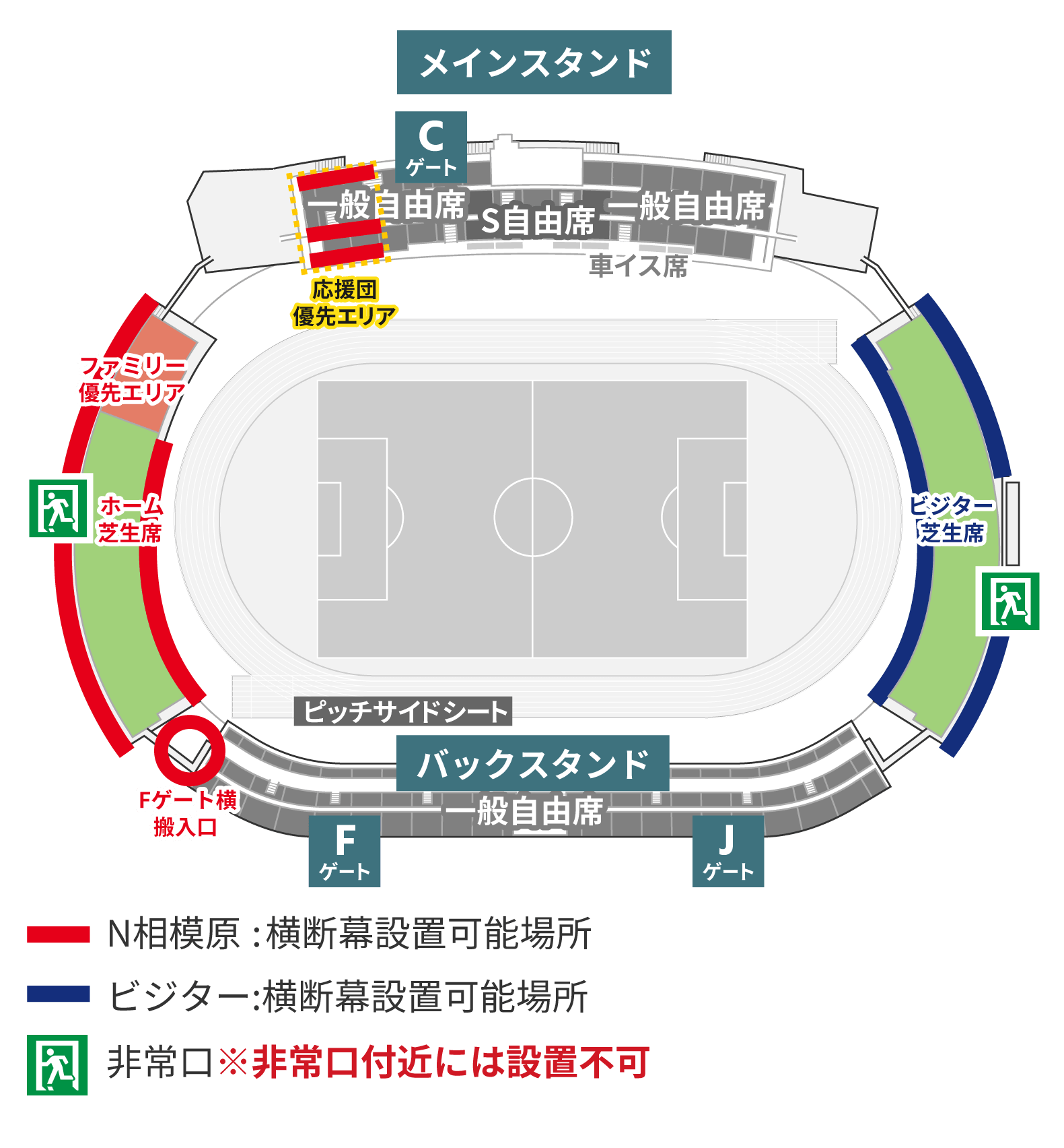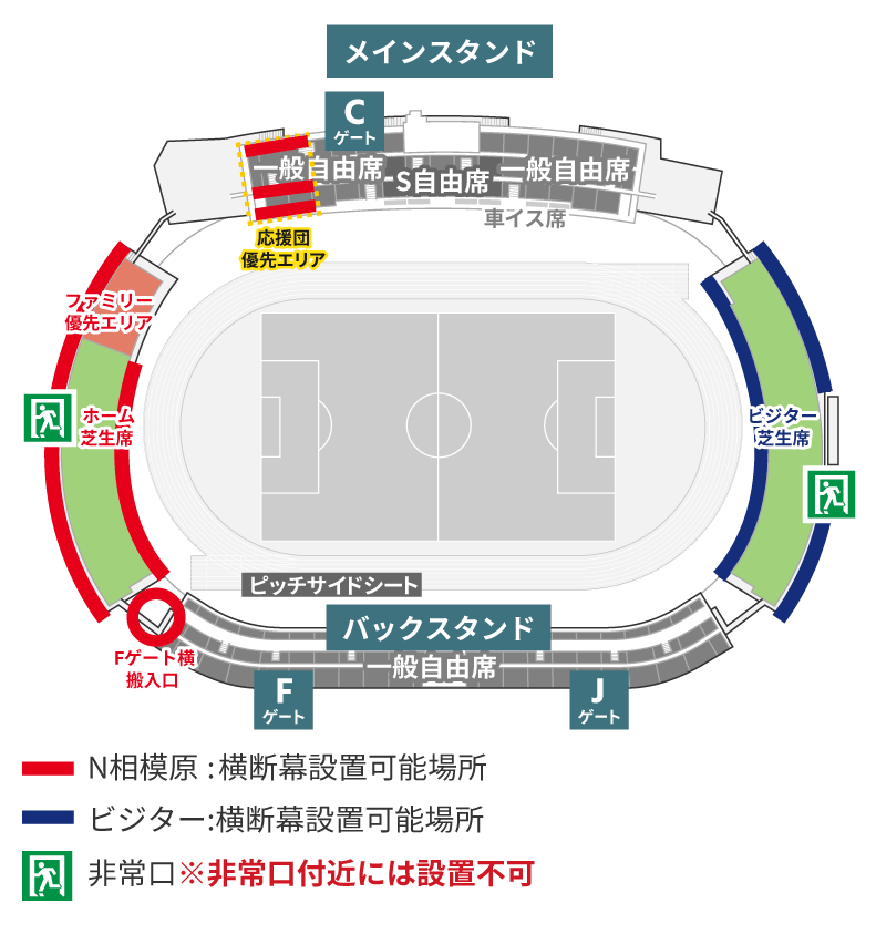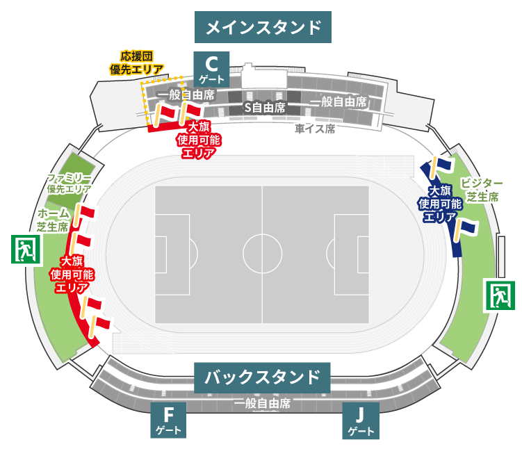 - ※ホームゴール裏芝生席・ホーム応援団優先エリア・ピッチサイドシートではビジターチームグッズの着用不可、ビジター応援団優先エリアではホームチームグッズの着用不可となります。入場口は分けておりませんのでホーム・ビジターのお客様ともに気持ちよく観戦できるよう、ご協力をお願いいたします。